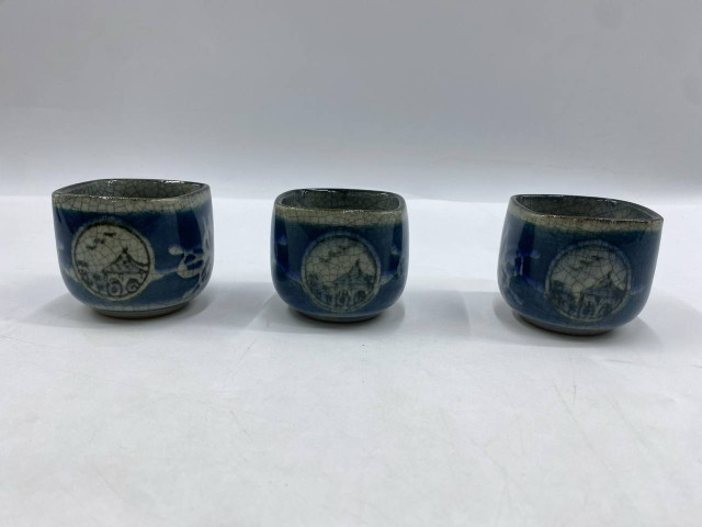 Set of 3 This is a Japanese-style glass tea or sake cup, glazed with a cracked blue and white finish and decorated with hand-painted landscape patterns.