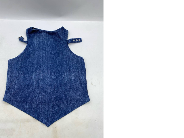 denim vest with a high neck and snap button closures on the shoulders.