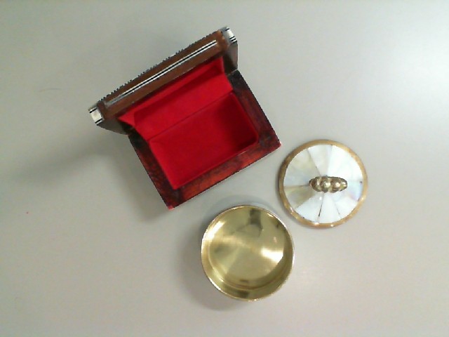 This exquisite set of two jewelry boxes is designed to elegantly store and display your treasures. The first box, crafted from rich wood, features a deep red velvet interior, providing a luxurious contrast to its polished exterior. Its intricate detailing and sturdy construction ensure both beauty and durability. The second box is a stunning brass dish with a decorative lid, adorned with a mother-of-pearl inlay. Perfect for keeping rings, earrings, or other small accessories safe and organized, these boxes are not only functional but also serve as beautiful decorative pieces for any vanity or dresser.