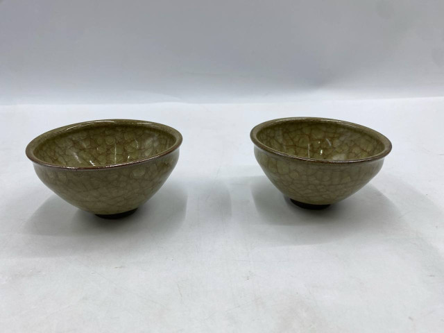 Set of 2 Japanese tea cup with an emerald green glaze and fine crackle glaze is called a yunomi.