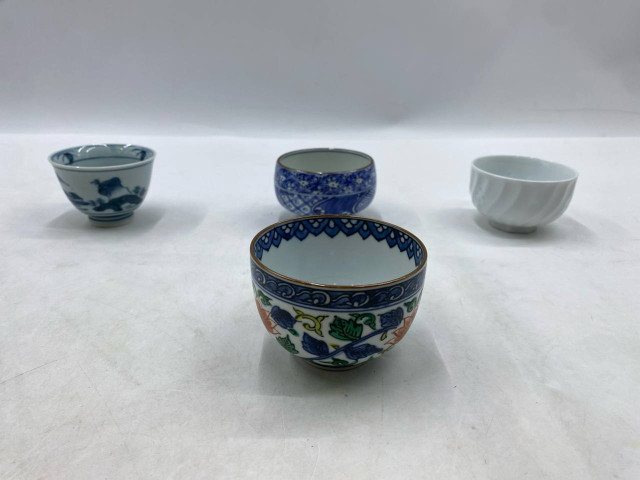 Set of 4 Japanese blue and white porcelain teacups, or Kiyomizu ware, from Kyoto, Japan.