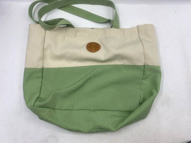 This fabric bag is designed for both style and functionality. It features a unique two-tone design, with a light beige upper portion and a refreshing green lower section, making it a versatile accessory suitable for various occasions. The bag is crafted from durable fabric, ensuring longevity and resilience against daily wear and tear. It has sturdy handles that provide a comfortable grip, allowing for easy carrying whether you are going to the grocery store, heading to work, or enjoying a day out. The bag also includes a stylish leather patch detail, adding an element of sophistication to its overall look. Its spacious interior can accommodate everyday essentials, making it an ideal choice for those seeking practicality combined with aesthetics.