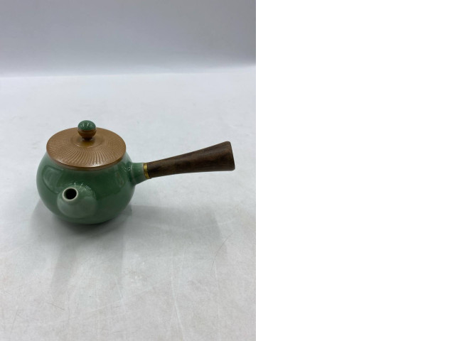 Green teapot with wooden handle on the side.