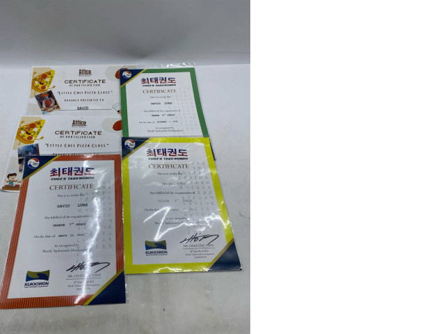 This set comprises five certificates from David Litre's Taekwondo school, showcasing a range of achievements in martial arts. Each certificate is uniquely designed, featuring a combination of vibrant colors and clear typography. Among the certificates are participation certificates for various classes, including one for a 'Little Chef Pizza Class,' which indicates involvement in a special cooking event. The Taekwondo certificates include accolades for different belt levels such as green, orange, and yellow, detailing the completion of respective requirements and bearing the official seals from World Taekwondo Headquarters. The documents are well-preserved, showcasing clean borders and distinct layouts that emphasize the importance of each accomplishment.