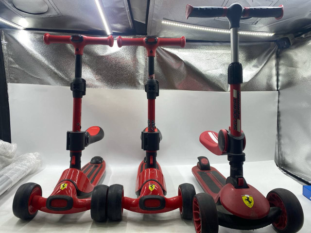 • Set of 3 Ferrari 2-in-1 foldable twist scooters for kids, which can be used as both a ride-on with a seat and a stand-up scooter.