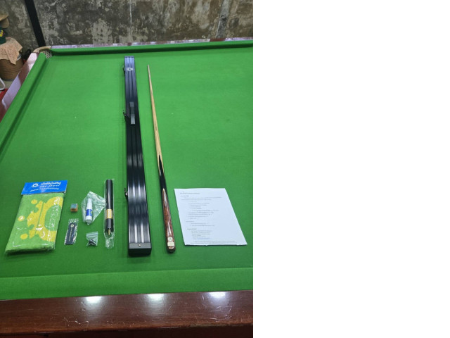 pool or snooker cue set, featuring an O'Min cue, a black aluminum hard case, and accessories.