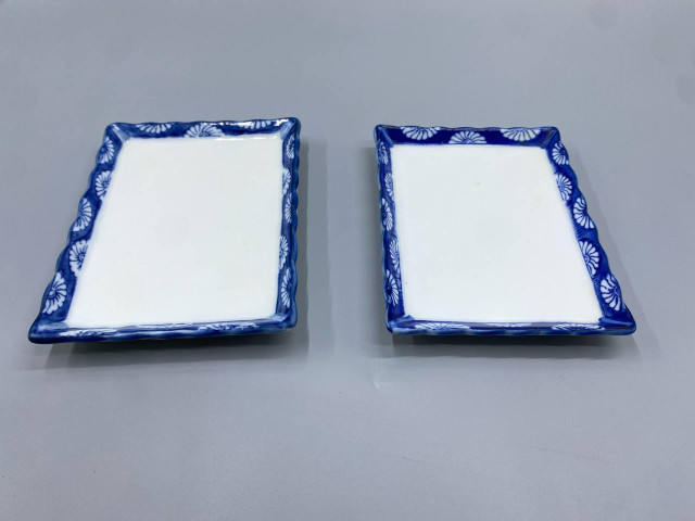 Set of 2 Yamashita Craft Fuchigiku Konori plates, which are diamond-shaped with a traditional underglaze blue and white chrysanthemum pattern.