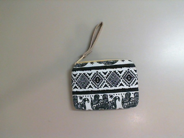 This charming small wallet features a delightful elephant design, set against a striking black and white patterned background. The wallet is crafted from a durable fabric that ensures longevity while maintaining a lightweight feel. It includes a secure zip closure that keeps your belongings safe. The exterior showcases a series of intricately designed elephants alongside decorative geometric patterns, adding a unique touch to the overall aesthetic. The wallet also has a convenient wrist strap, making it easy to carry around. Perfect for holding cash, cards, and small valuables, this wallet combines functionality with a playful, artistic design.