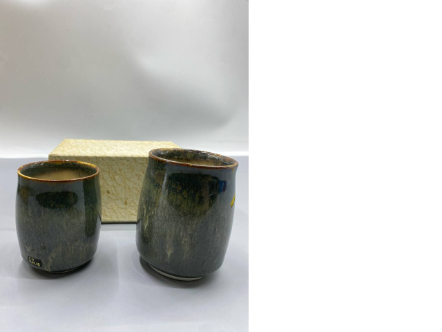 Set of 2 Japanese handcrafted glass teacups, in the style of Meoto Yunomi (a set for husband and wife), are often presented in a Tomobako wooden box.