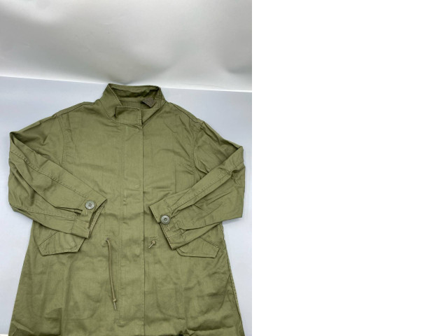 utility-style utility jacket or parka in olive green, likely featuring a stand collar and adjustable waist drawstring similar to classic fishtail designs.