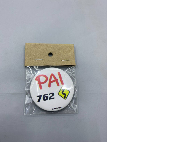 This brooch features a circular design with a bright white background. The central part of the brooch displays the word 'PAI' in bold red letters, emphasizing its playful and vibrant nature. Below this, the number '762' is printed in a contrasting black color, adding a unique identifier to the piece. To the side, there is a yellow traffic sign-like graphic that includes a winding road symbol, which enhances the thematic appeal of the brooch. It is packaged in a clear plastic pouch with a brown card backing, suggesting it can be a great gift or a personal accessory for casual wear.
