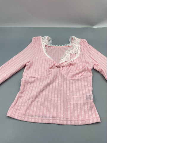 pink long-sleeved top featuring a sweetheart neckline with white lace patchwork detailing.