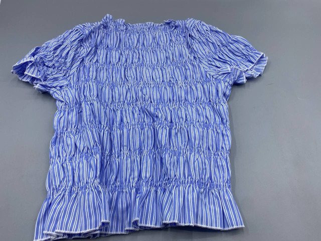 The Damson Madder Becca blouse is characterized by its pleated bodice, puffed sleeves, and stripes.