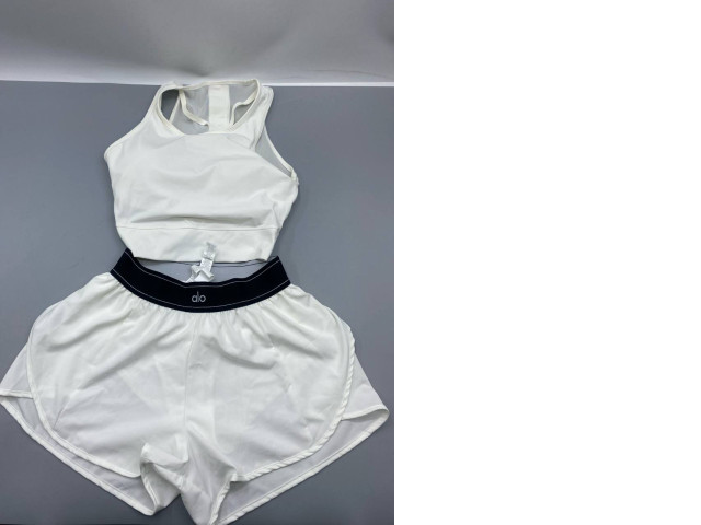 This set of workout clothes features a stylish white tank top and matching shorts. The tank top has a modern cut with a racerback design, ensuring a comfortable fit during any physical activity. It is made from a lightweight and breathable fabric that allows for optimal airflow, helping to keep the wearer cool and dry. The shorts are designed with a loose fit, providing ease of movement and flexibility. They feature an elastic waistband that is complemented with a contrasting black band, adding a touch of elegance to the ensemble. The smooth texture of the fabric contributes to the overall comfort, making this workout outfit ideal for both exercise sessions and casual wear.
