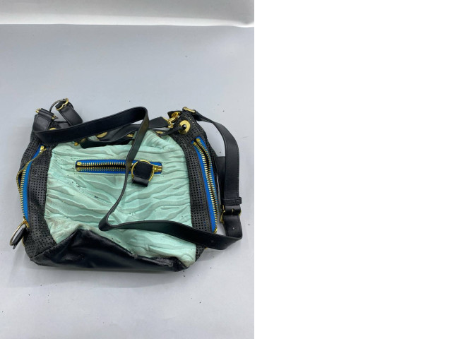 This stylish shoulder bag features a contemporary design, blending functionality with fashion. The body of the bag showcases a unique textured mint green material that adds a pop of color and depth, complemented by black leather accents that provide durability. The striking contrast between the mint green and black creates a visually appealing look. It is equipped with multiple zippered pockets, including a prominent blue zipper that adds an extra touch of style and ensures security for your belongings. The adjustable shoulder strap offers versatility in wear, allowing you to find the perfect fit. Ideal for both casual outings and more polished events, this bag is a must-have accessory for any wardrobe.