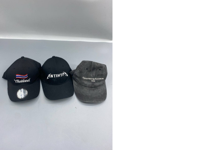 This set includes three stylish caps, each featuring unique designs. The first cap is embroidered with the word 'Thailand' and a flag motif, giving it a cultural touch. The second cap showcases the name 'ANTHYPS' in a bold, modern font, ideal for streetwear enthusiasts. The third cap offers a vintage look with faded text reading 'Архитектор Коскяков 1906', adding a historical flair. All caps are primarily black, crafted from durable fabric with a comfortable fit and adjustable strap. Perfect for casual outings or as a trendy accessory for any outfit.