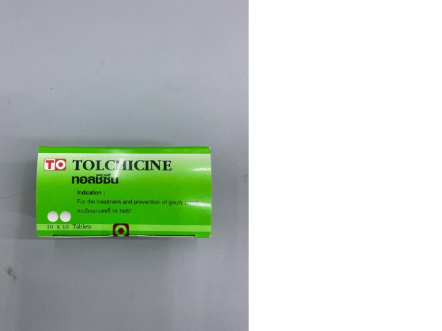 Packaging for tolchicine tablets, a medication used to treat and prevent gout flare-ups.