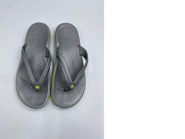 graphite gray and neon green Crocs Crocband Flip Flops.