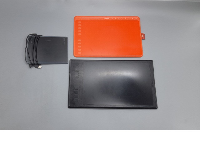 Set of 3 Huion graphics drawing tablets, including models like the HS611 (coral red) and likely the H1161 or H950P.