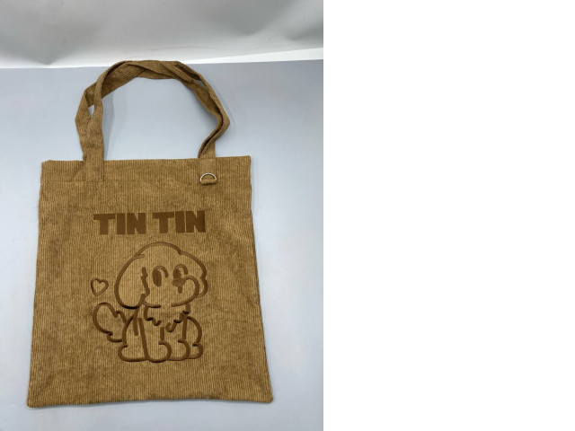 This corduroy tote bag features a playful design with a cute dog illustration and the words 'TIN TIN' prominently displayed. Made from soft and durable corduroy fabric, it provides a stylish yet practical accessory for everyday use. The warm brown color adds a touch of sophistication, while the texture of the fabric gives it a unique and tactile quality. The bag is equipped with sturdy handles for comfortable carrying, making it perfect for shopping, outings, or as a casual everyday bag. Its spacious interior allows for ample storage, ensuring you can carry your essentials with ease.