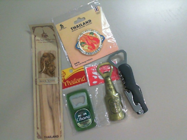 A souvenir set from Thailand, including a bookmark, magnet, and 3 bottle openers.