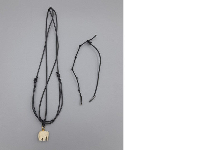 Set of 2 A black braided cord necklace with a plastic elephant pendant.