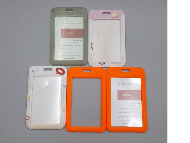 Set of 5 vertical plastic ID card holders designed for work permits or badges.