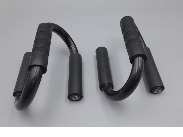 pair of S-shaped push-up bars, commonly used for chest, shoulder, and triceps training.