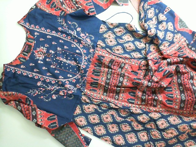 This exquisite cotton scarf features a rich navy blue base adorned with a detailed pattern of small,..