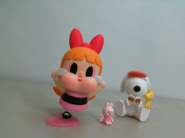 This charming set includes three collectible figures that are sure to delight fans and collectors alike. The first figure is a humanoid character with pink bunny ears and a matching pink and black ensemble, capturing an adorable, wide-eyed expression that suggests innocence and curiosity. Accompanying this figure is a classic white dog character, complete with a yellow bird companion perched happily upon its head. This canine figure exhibits a relaxed posture, sitting with one ear adorably flopped to the side, embodying a sense of calm companionship. The smallest of the trio is a tiny pink creature, seemingly inspired by a rabbit, which adds an extra touch of cuteness to the overall set. Each figure is crafted with attention to detail, featuring bright colors and endearing poses that are designed to appeal to collectors of all ages. These figures would make a wonderful addition to any display, invoking nostalgia and a playful spirit.