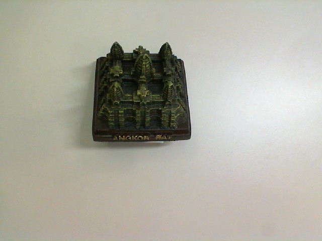 This souvenir figurine is a detailed miniature replica of the iconic Angkor Wat temple in Cambodia, one of the largest religious monuments in the world. The figurine has been carefully crafted to showcase the intricate architectural details of the temple's towers and facades. The name 'ANGKOR WAT' is visibly inscribed on the base, confirming its representation and adding authenticity to the piece. This memento is likely made of a durable material, such as resin, to capture the complex carvings and structures. Its compact size suggests it's designed for easy display or as a keepsake for travelers wishing to remember their visit to this UNESCO World Heritage site. The figurine's historical significance and the craftsmanship involved in its creation make it an appealing collectible or gift for those interested in history, architecture, or world cultures.