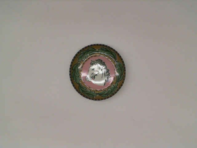 This charming small plate features a delicate illustration of what appears to be a West Highland White Terrier dog at the center, set against a soft pink background. Encircling the central image is a wreath of green foliage with subtle accents that lend a classic and somewhat vintage feel to the design. The plate edges are finished with a contrasting darker tone, framing the artwork beautifully and adding an elegant touch. The size of the plate suggests it may be perfect for serving small treats or as a decorative piece to adorn a space with a touch of whimsy and nostalgia.