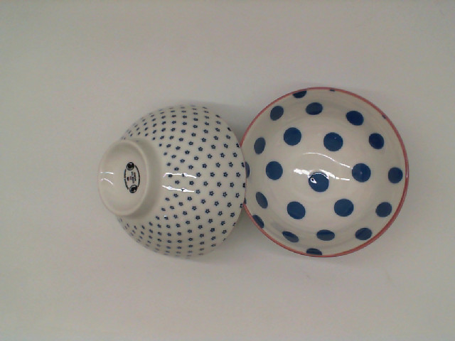 This delightful set includes two pieces: a small cup and a bowl, both adorned with an appealing pattern of blue polka dots. Each piece is unique, with the cup featuring a dense array of tiny dots creating an almost textured look, while the bowl showcases larger, playful dots scattered across a white background. The red trim on the bowl adds a pop of color, enhancing the vibrancy of the set. Perfect for serving condiments, nuts, or small snacks, these charming items combine functionality with a cheerful aesthetic that is sure to brighten any table setting.