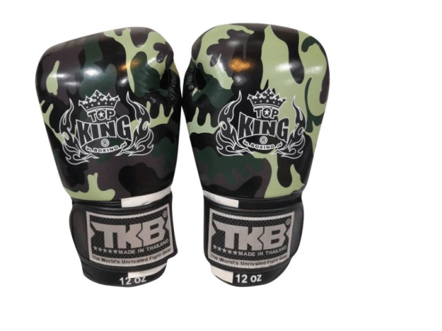 These Top King boxing gloves feature a distinctive camouflage pattern in various shades of green, giving them a bold and unique appearance. Made in Thailand, these gloves are labeled with 'The World's Unrivaled Fight Gear,' indicating their high-quality craftsmanship. The gloves display the Top King logo prominently on the upper part, with a reflective surface that adds visual interest and might be effective in catching an opponent's eye during a match. They also have a hook-and-loop fastener with a fabric label at the wrist for a secure fit, ensuring the gloves stay in place during rigorous training or bouts. The '12 OZ' marker indicates the weight class of the gloves, which is a common size for sparring and provides a good balance between protection and weight. The combination of ergonomic design, visual appeal, and the reputation of being made by a well-known manufacturer of fight gear makes these gloves a desirable choice for both amateur and professional boxers looking for style and quality in their equipment.