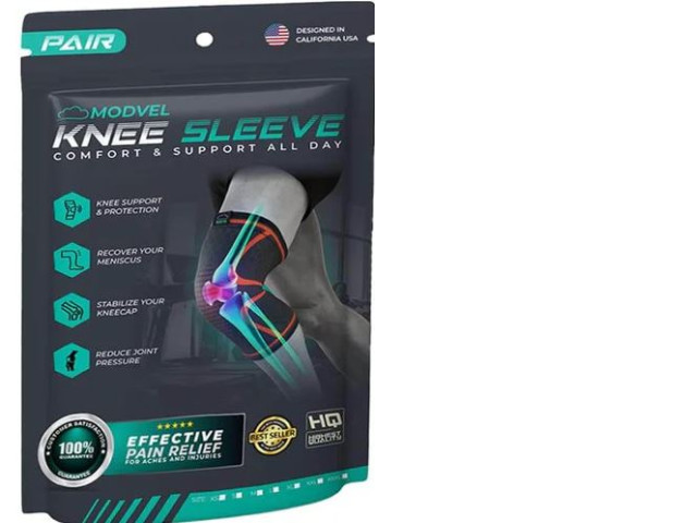 The Modvel Knee Sleeve is designed to provide comfort and support throughout the day. This knee sleeve offers knee support & protection, making it suitable for recovery from injuries or for those seeking additional joint stability. The product highlights its ability to stabilize the kneecap and to reduce joint pressure, which can alleviate discomfort and improve mobility. Notably, the sleeve promises effective pain relief for aches and injuries, which is emphasized as a key feature on the packaging. The knee sleeve, as depicted in the image, appears to have a snug fit with reinforced areas around the knee joint, which indicates targeted support. Its ergonomic design and the highlighted contours on the visualization suggest that it contours to the natural shape of the knee, ensuring both ease of movement and tightness of fit. Such features are likely to appeal to users who require both comfort and functionality from their knee support. Moreover, the 'Best Seller' badge hints at the product's popularity among consumers, and the packaging indicates that it is designed in California, USA, offering an assurance of quality to potential buyers.