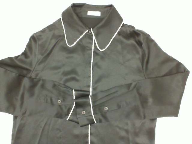This sophisticated women's long-sleeved black shirt features a sharp collar and a wrap-around style ..