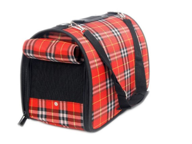This stylish red and white cat carrier features a classic plaid design, bringing a touch of elegance..