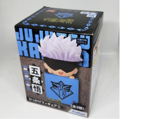 This product is a collectible figure depicting Gojo Satoru, a popular character from the anime series 'Jujutsu Kaisen.' The packaging reveals the character's iconic spikey white hair peeking out, suggesting the figure's meticulous attention to the distinguishing features that fans adore. It appeals to collectors and fans of the anime with its authentic design and packaging that teases the character's playful charm. An additional appeal comes from the branding elements, prominently displayed, which speak to the figure's official merchandise status.