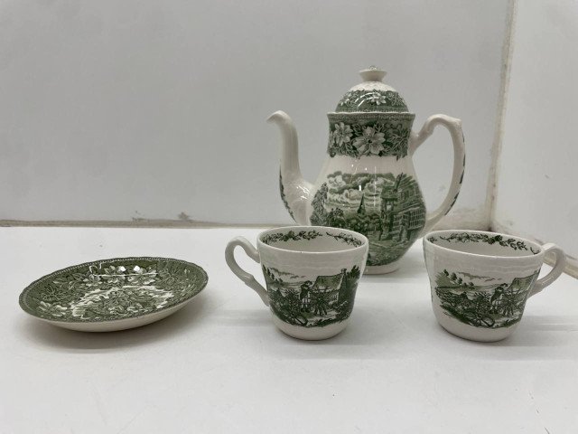 This exquisite set of green kitchen service features a beautifully designed teapot and matching cups, all adorned with intricate floral and pastoral scenes that evoke a sense of elegance and tradition. The rich green color not only adds a touch of nature indoors but also complements a variety of table settings. The delicate craftsmanship in the porcelain ensures durability, making it perfect for both everyday use and special occasions. The set includes: 2 cups 1 kettle 1 saucer