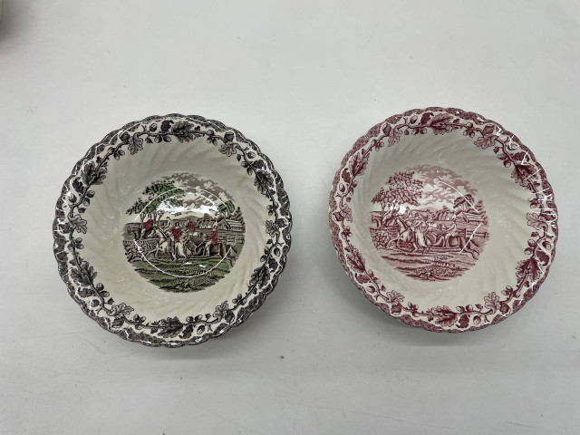 This elegant set of 3 red saucers features intricate floral patterns and a picturesque landscape sce..