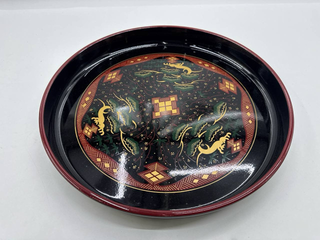 This elegant black glass plate features a stunning gold pattern that adds a touch of sophistication to any table setting. The design showcases intricate details, including motifs inspired by nature, such as leaves and stylized creatures, all set against a rich black background. The plate has a glossy finish, enhancing its luxurious appearance while allowing the vibrant colors of the pattern to stand out. Perfect for both decorative display and serving, this plate combines functionality with artistic flair, making it an ideal addition to any home décor.