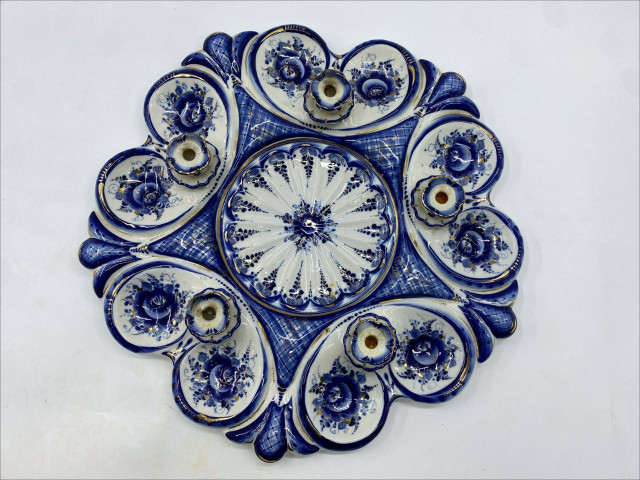 This exquisite serving plate, designed for cakes and Easter eggs, features a stunning combination of blue and white porcelain. The plate showcases a vintage aesthetic, incorporating intricate floral designs and delicate patterns that evoke a sense of nostalgia. The central portion of the plate is adorned with a radial pattern, enhancing its elegance, while the surrounding compartments are designed in heart shapes, perfect for presenting pastries or decorative eggs. The glossy finish of the porcelain adds a touch of sophistication, and the gold accents further elevate its luxurious appearance. Ideal for special occasions or to enhance your dining decor, this serving plate blends functionality with timeless artistry.