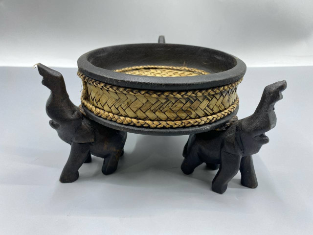 a handcrafted Thai wooden and rattan bowl supported by carved elephant figures, often used for decorative purposes or serving snacks.