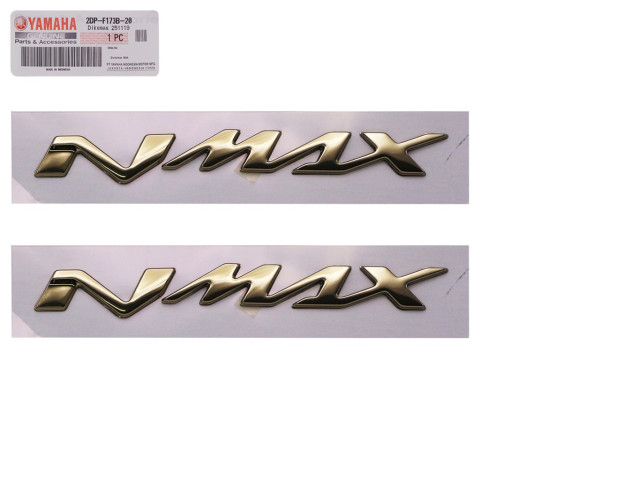 • Set of 2 3D embossed NMAX logo, gold color, 1 side (self-adhesive). Genuine Yamaha logo for ALL NEW NMAX, NMAX (2DP-F173B-40).