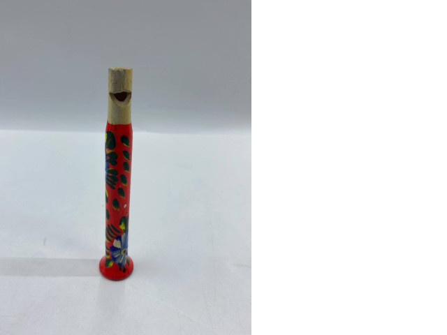 This wooden flute is a beautifully crafted musical instrument, showcasing vibrant colors and intricate designs. The body of the flute is primarily painted in a bright red, adorned with floral patterns that add a decorative touch. The contrasting colors of the flowers, likely in shades of blue and green, enhance its visual appeal. The flute features a traditional design with a mouthpiece that is crafted from natural wood, giving it an authentic look. Its lightweight and compact size make it easy to handle, making it suitable for both beginners and experienced players. The decoration not only serves an aesthetic purpose but also reflects a cultural artistry typical in wooden musical instruments.