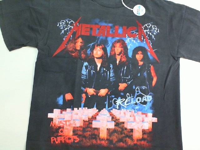 This is a collector's edition Metallica T-shirt featuring a vivid graphic print of the band members with a red Metallica logo overhead. The shirt also showcases iconic album references like 'Master of Puppets' and 'Reload' with eye-catching graphics mixed with a graveyard scene. The main color of the T-shirt is black, and it is a size XL, perfect for fans who prefer a looser fit. Additionally, the integration of the band's album art creates a nostalgic and powerful connection for fans, enhancing the shirt's appeal as a piece of Metallica memorabilia.