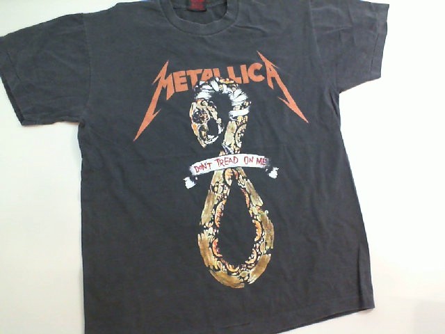 This T-shirt features iconic imagery associated with the legendary heavy metal band Metallica, showcasing a striking snake graphic with the band's classic logo above it. The design includes the slogan 'Don't Tread on Me', adding an edgy and rebellious flair that reflects the band's ethos. The shirt is size Large and comes in a versatile black color, making it a perfect fit for fans looking to express their admiration for Metallica's music and style. The bold orange and white colors of the logo contrast sharply against the black fabric, ensuring the design stands out. Ideal for concerts, casual outings, or as a collectible for enthusiasts.