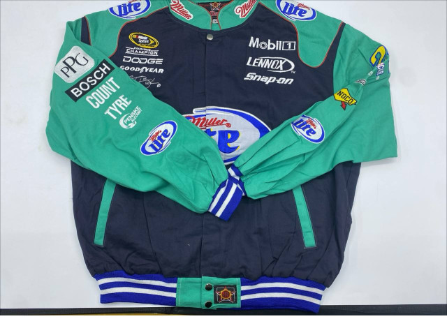 This vintage NASCAR jacket features a striking color combination of green and navy, representing Kyle Busch's racing brand from the 90s, with prominent Kellogg's Honey Smacks branding. The jacket is adorned with multiple embroidered patches showcasing sponsor logos like Mobil 1, Dodge, and Miller Lite, reflecting the authentic racing culture. The ribbed cuffs and waistband add to its retro appeal, making it a standout piece for both racing enthusiasts and collectors. Its roomy fit ensures comfort while showcasing a nostalgic tribute to a golden era of NASCAR.