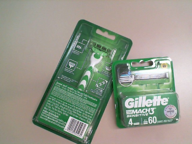 The product is a set from Gillette, which appears to include a Mach3 sensitive razor and replacement blade cartridges. The packaging suggests that the blades are designed for sensitive skin, which could provide a comfortable shave with less irritation. The visible razor handle design indicates an ergonomic grip that may offer precise control during shaving. The replacement blade cartridges are presented in a pack, seeming to promise longevity with up to 60 shaves per cartridge, providing value for the consumer. The overall green-themed packaging is consistent with Gillette's branding and could appeal to those who are already familiar with the brand's reputation for quality shaving products.