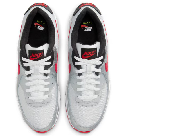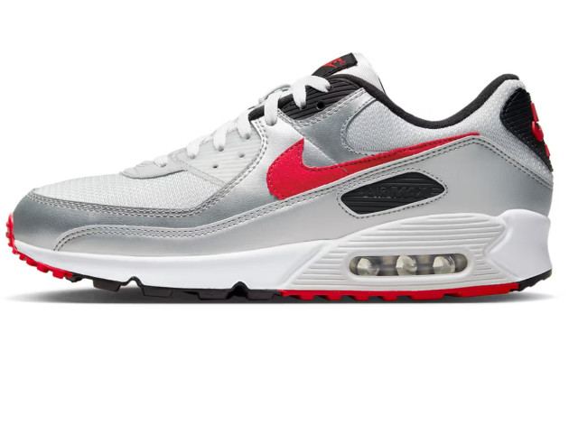 The Nike Air Max 90 Icons exudes a classic and timeless appeal, showcasing the legendary styling of one of the most iconic sneaker designs. The shoes feature a sleek white and silver colorway, accented by pops of vibrant red, particularly on the Nike Swoosh and surrounding areas, lending a bold contrast to the otherwise understated palette. The mesh upper provides breathability, while the leather overlays add support and durability. The Air Max unit in the heel is visible through a cut-out window, an emblematic detail that not only offers a glimpse into Nike's innovative cushioning technology but also delivers exceptional comfort underfoot. A black interior lining creates a sharp visual profile and a snug, comfortable fit. The rubber outsole has a waffle pattern for traction and durability, and bright red accents on the sole further highlight the shoe's stylish design. Overall, this model is a perfect blend of performance features and trendy aesthetics, making it suitable for both athletic pursuits and casual everyday wear.
